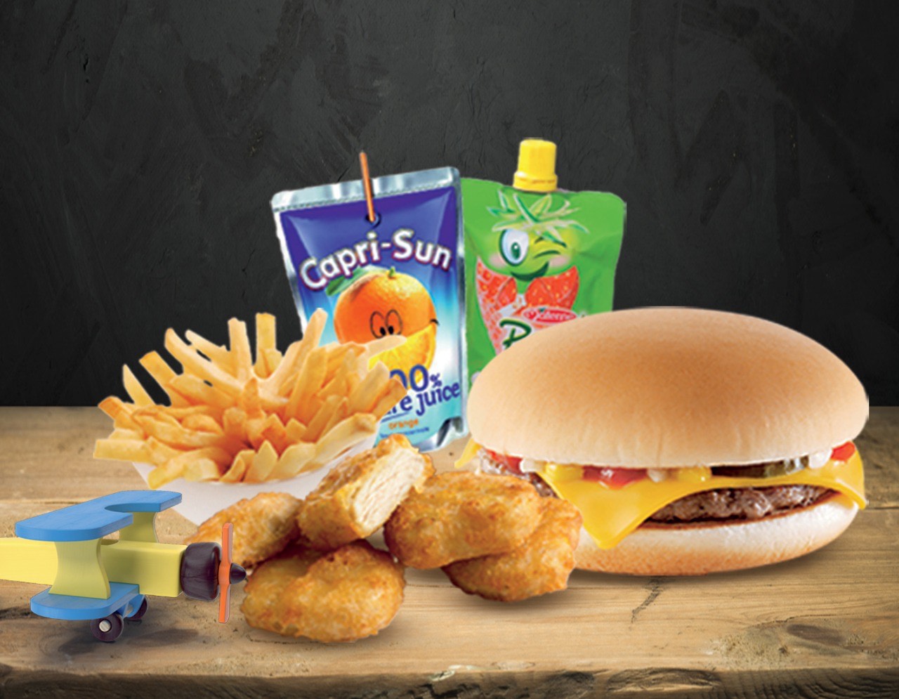 Hamburger or Nuggets, Fries, Compote, Caprisun or Water