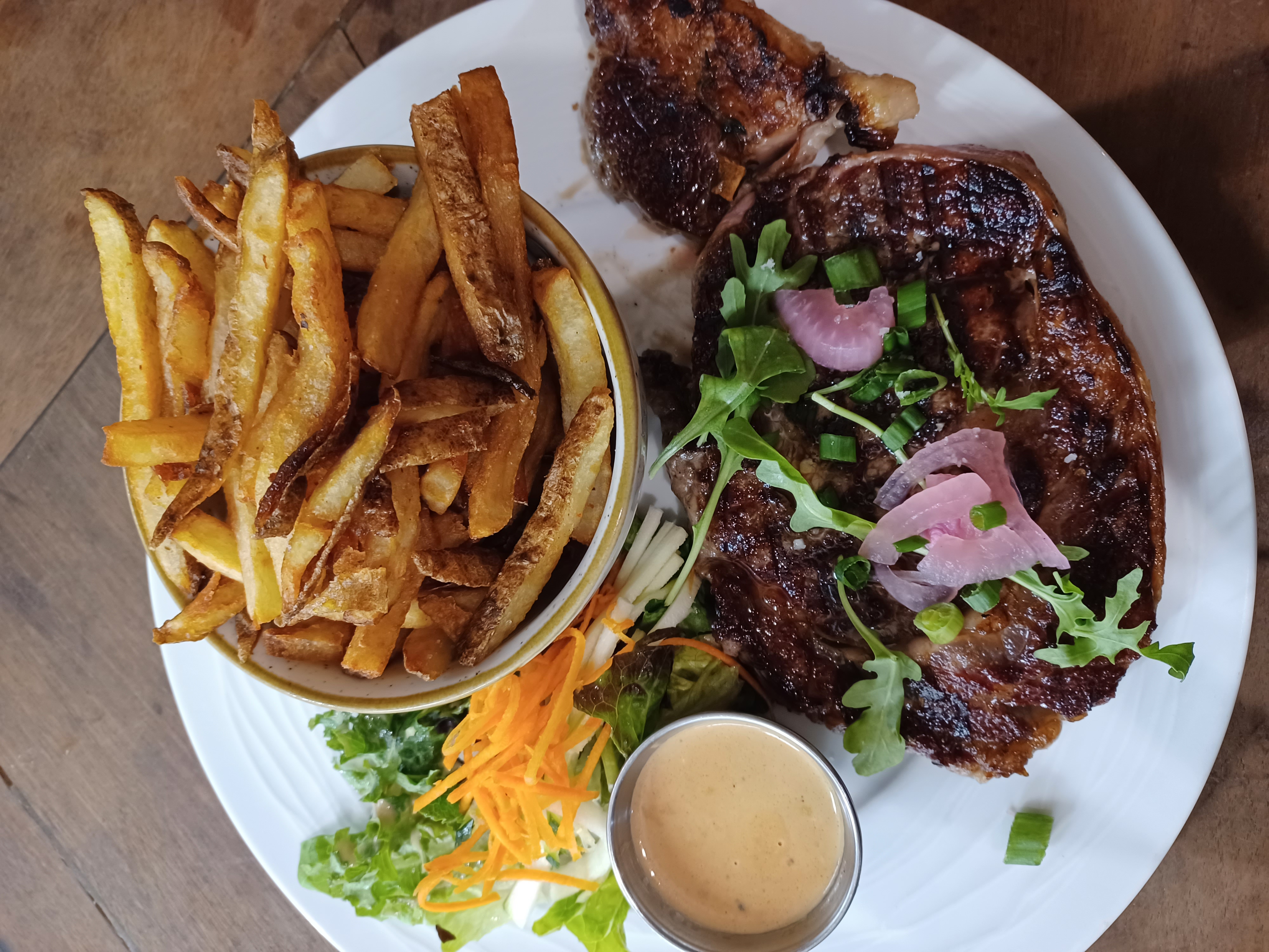 Brioche bread, angus steak, maroilles cheese, caramelized onions, salad, tomato, french fries