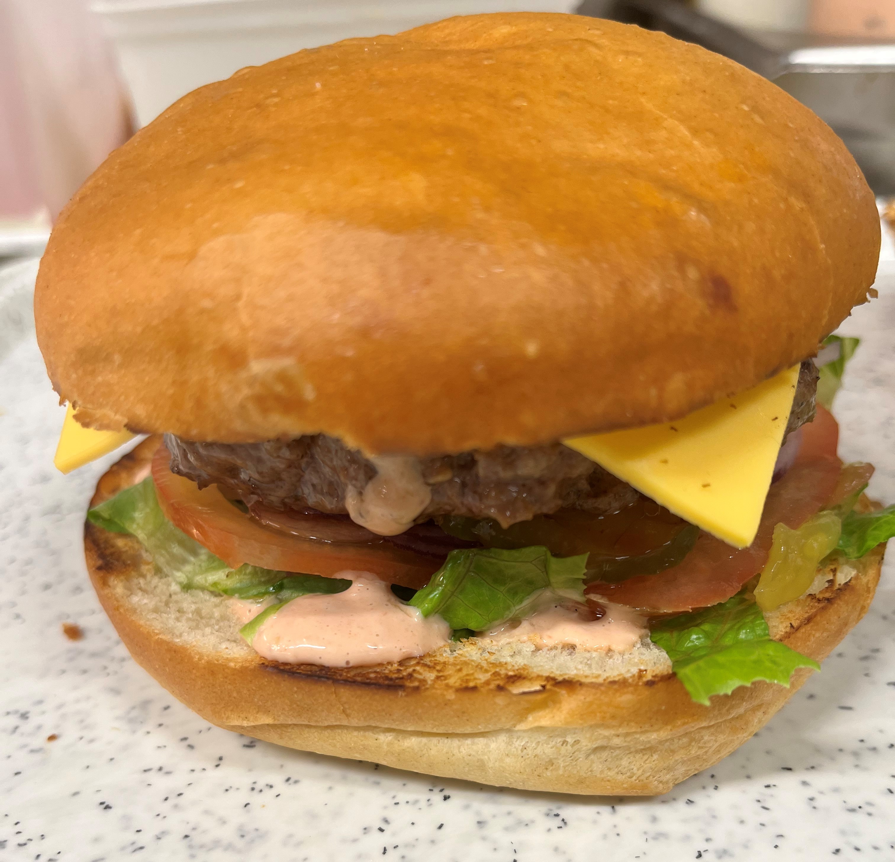 Mayo, BBQ sauce, angus hamburger, katsu chicken, bacon, peperoni, lettuce, tomato, onion, pickle, cheddar cheese