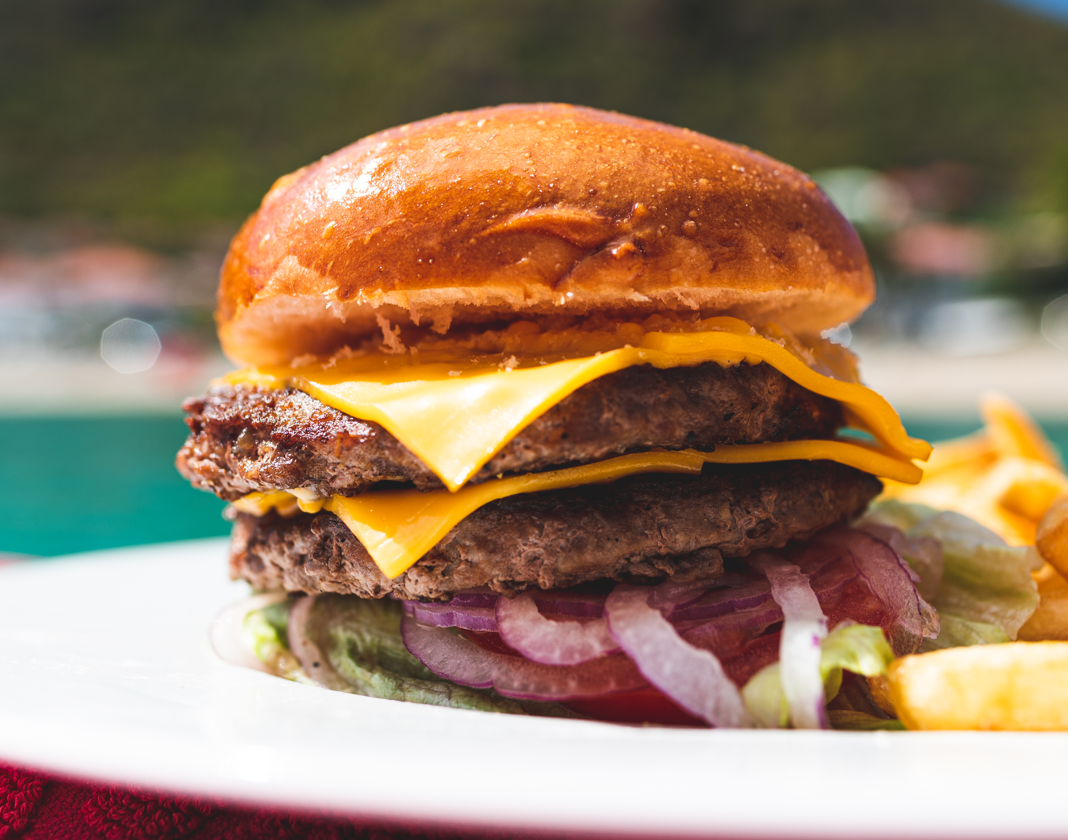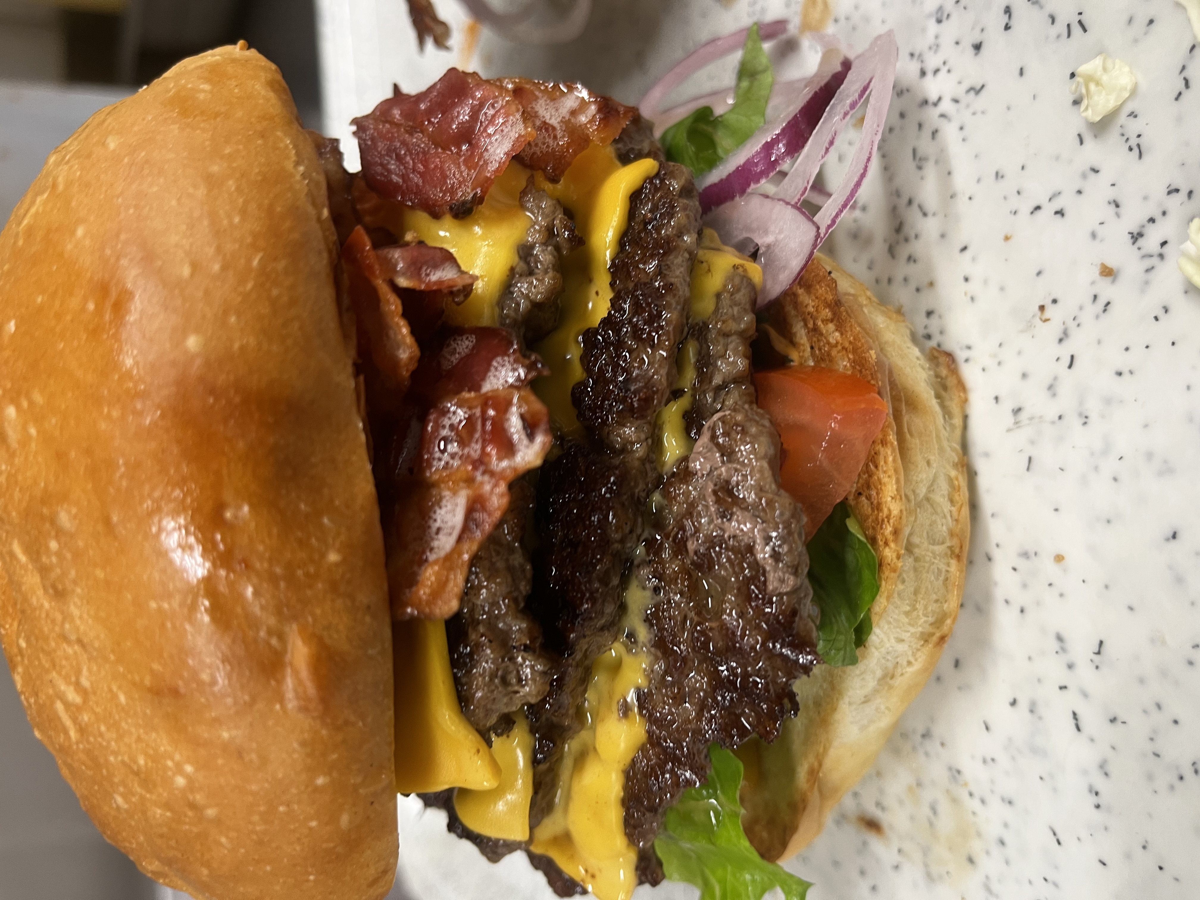 Double steak, double cheddar, salad, raw onion, tomato, pickles, bacon, burger sauce