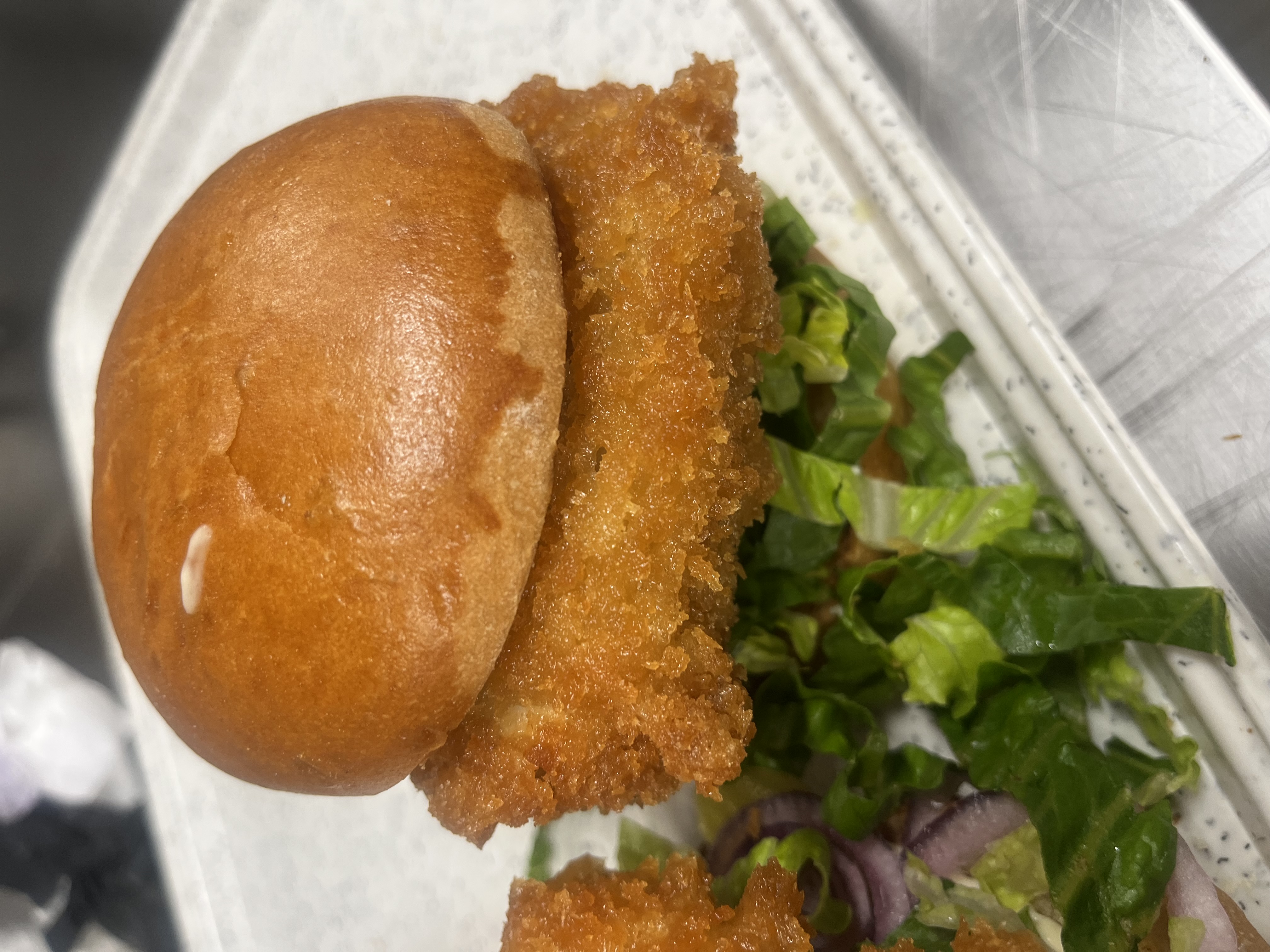 Homemade breaded chicken breast, salad, raw onion, mayo sauce