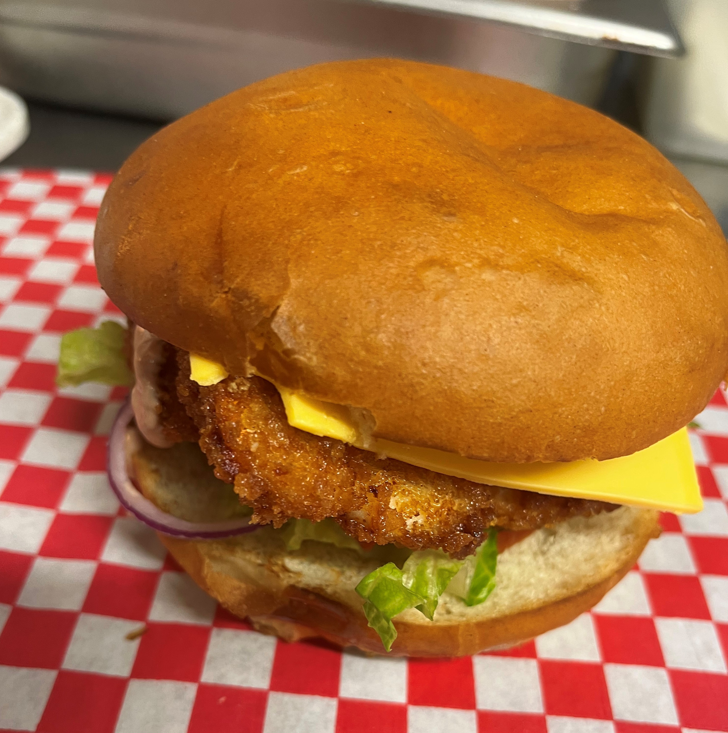 Homemade breaded chicken breast, salad, raw onion, cheddar, bacon, mayo sauce