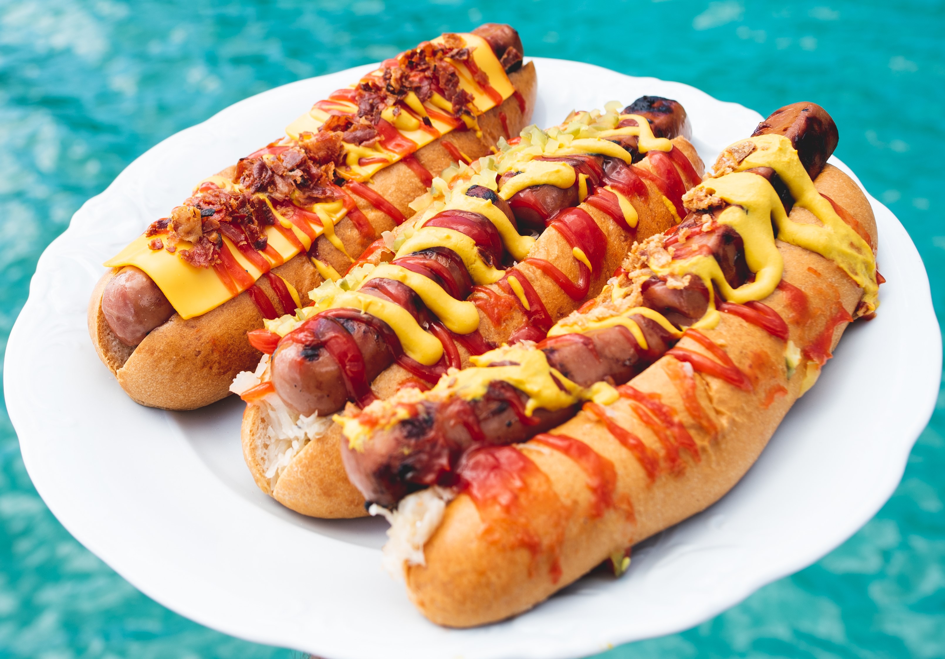 Fresh bun, X2 chicken sausages, bacon, cheddar sauce, mustard, ketchup