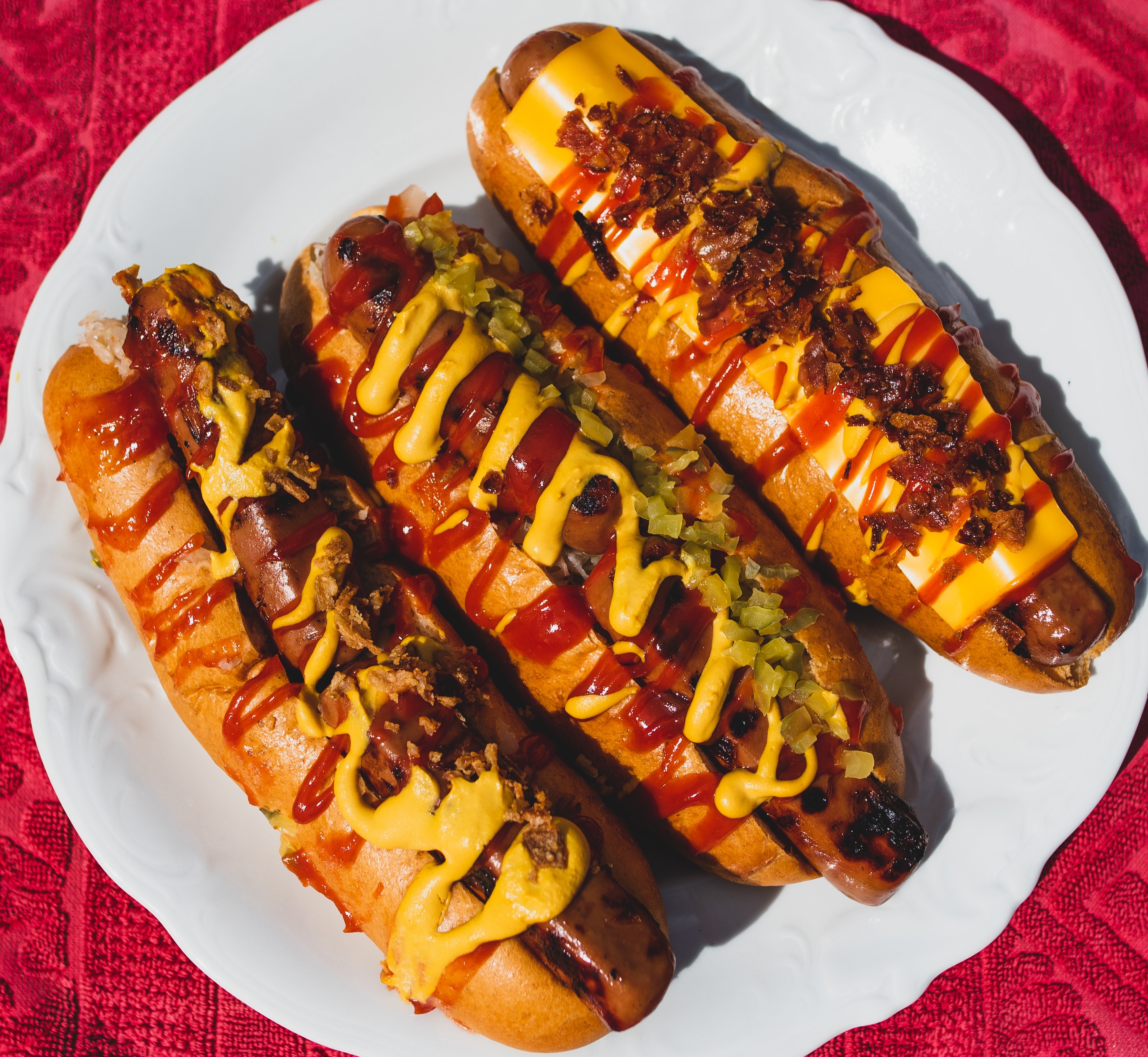 Fresh bun, Sauerkraut, x 2 chicken sausages, Fried onion, Cheddar sauce, Mustard, Ketchup